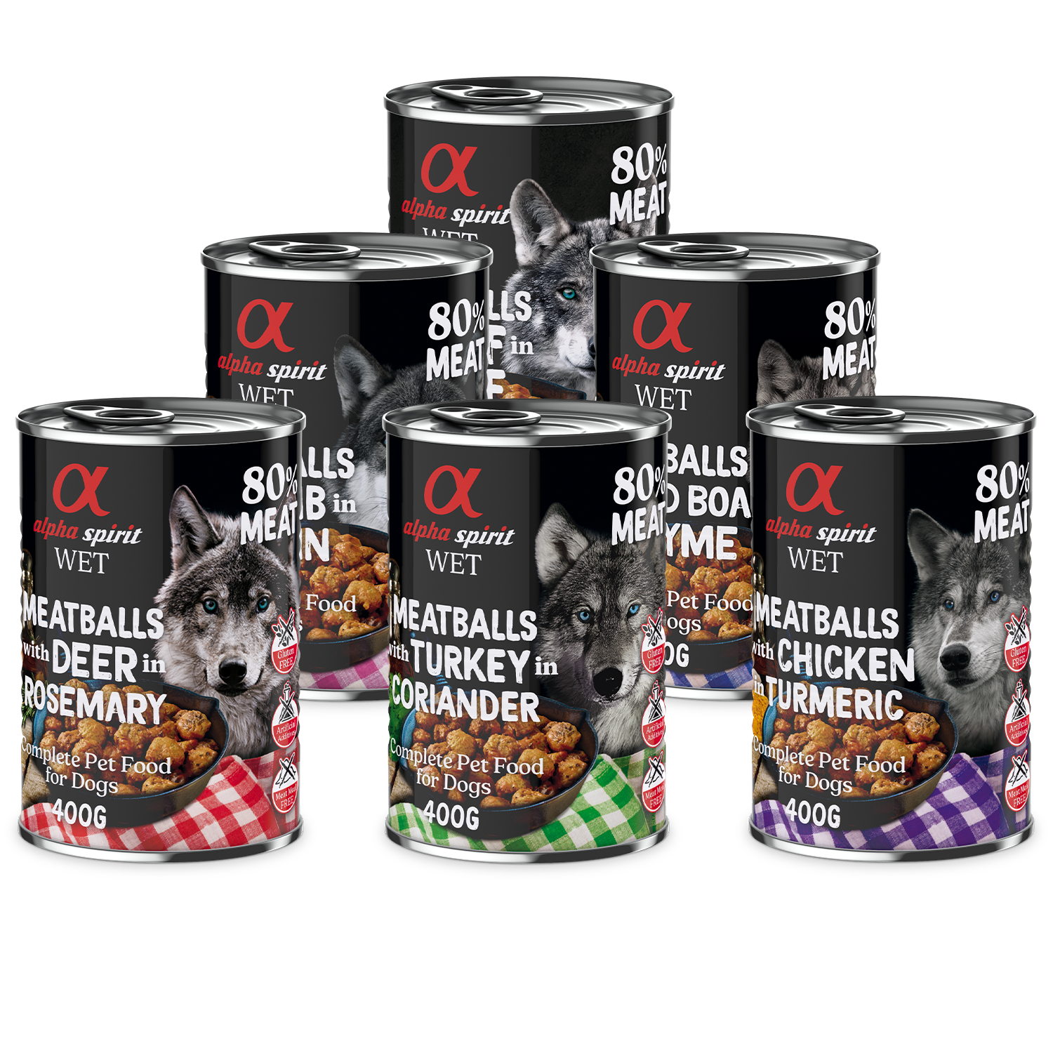 Our MeatBalls combine everything a complete dog food needs. The wet food contains succulent meatballs and a flavorful meat broth to offer your dog a unique taste experience. Each variety consists of different high-quality meats with an exceptionally high meat content of 80%. The recipes are rounded out with vegetables and herbs. This ensures your four-legged friend receives all the essential ingredients for a balanced and species-appropriate diet. Naturally, our MeatBalls are produced according to our strict standards, without artificial flavor enhancers, grains, or gluten .